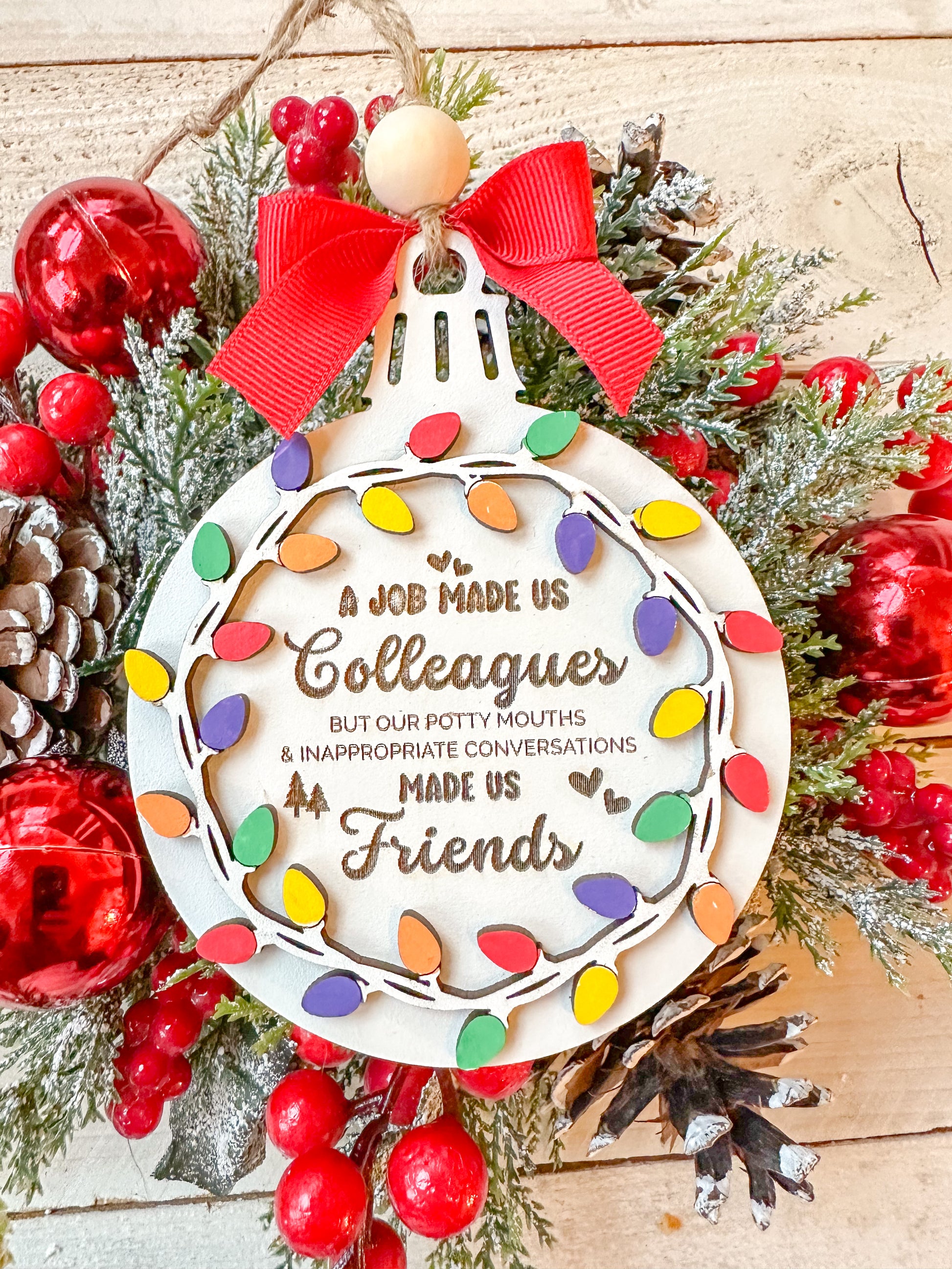 Turn your workplace memories into holiday magic with the Colleagues to Friends Ornament. Featuring the cheeky and heartfelt phrase, “A job made us colleagues, but our potty mouths & inappropriate conversations made us friends,” this ornament perfectly captures the special bond you share with your favorite coworkers.