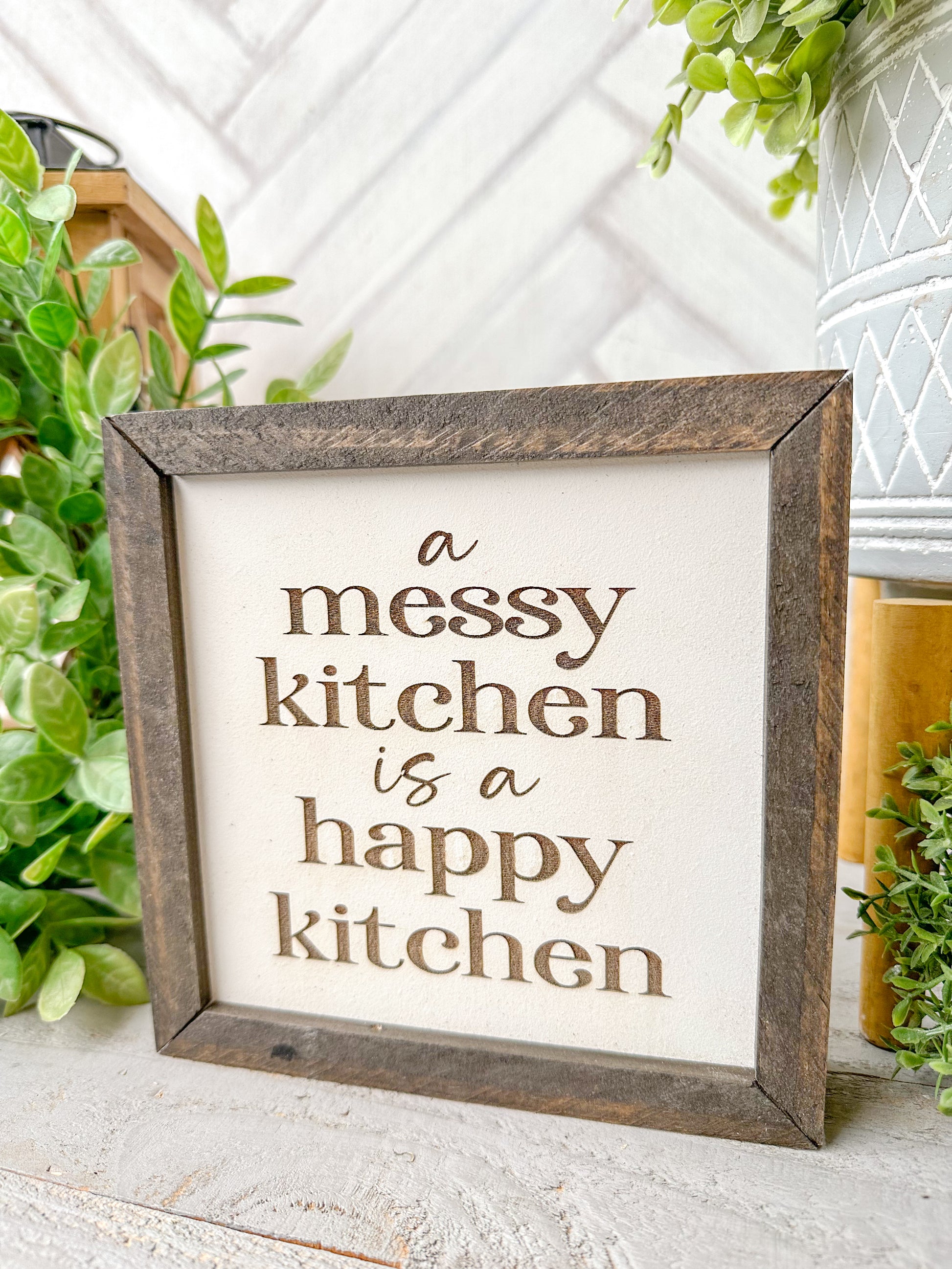 Celebrate the heart of the home with this charming “A Messy Kitchen Is a Happy Kitchen” laser engraved wooden sign. Perfect for adding warmth and humor to your kitchen decor, this handcrafted sign embraces the chaos of cooking and baking with a playful touch.