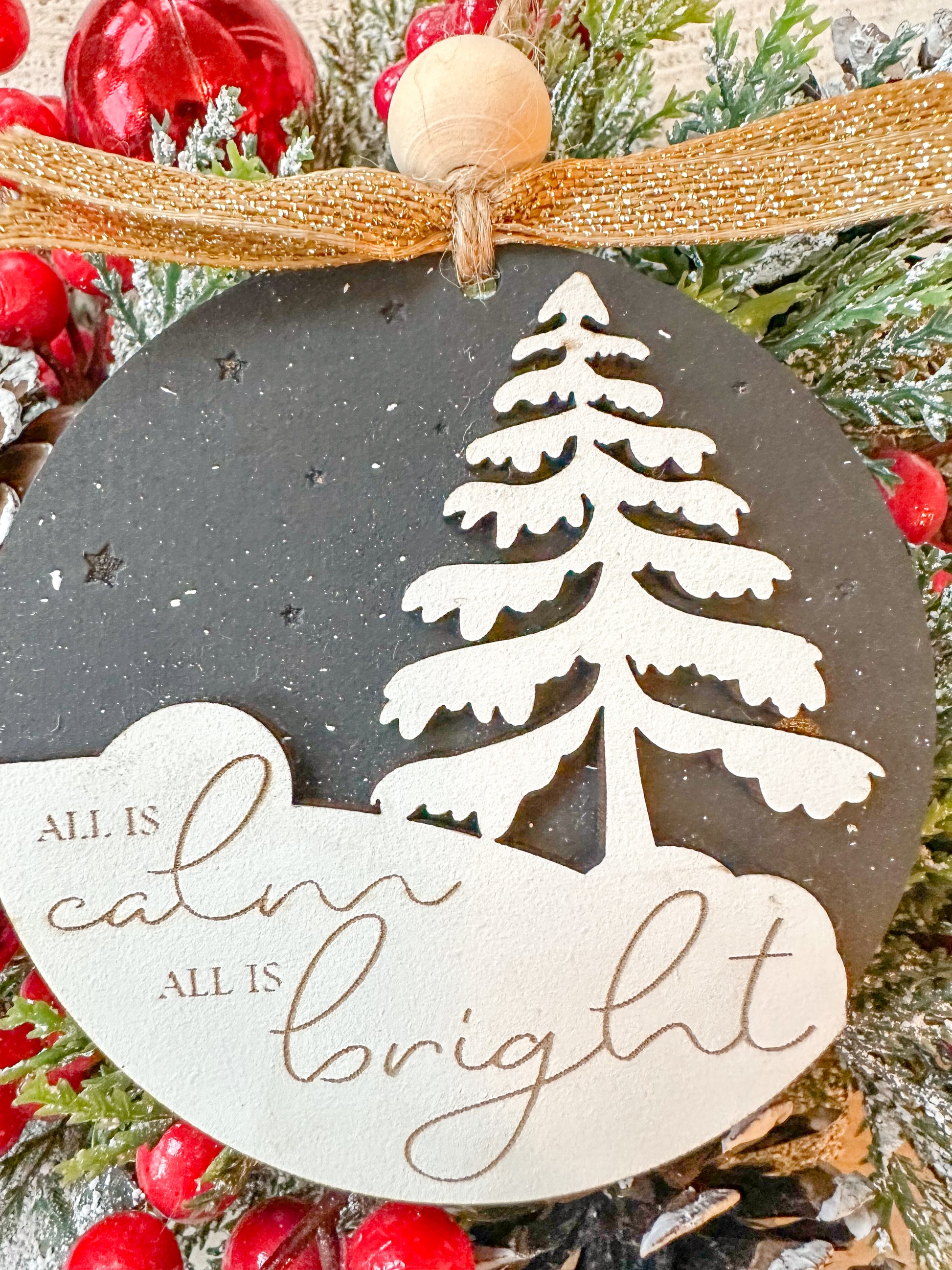 Embrace the peaceful beauty of the season with this stunning "All Is Calm, All Is Bright" ornament. Featuring a serene winter scene with a 3D evergreen tree and delicate engraved text, this ornament brings a touch of elegance and tranquility to your holiday decor. Adorned with a gold bow and rustic twine hanger, it's the perfect addition to your Christmas tree or a thoughtful gift for someone who loves the quiet magic of winter.