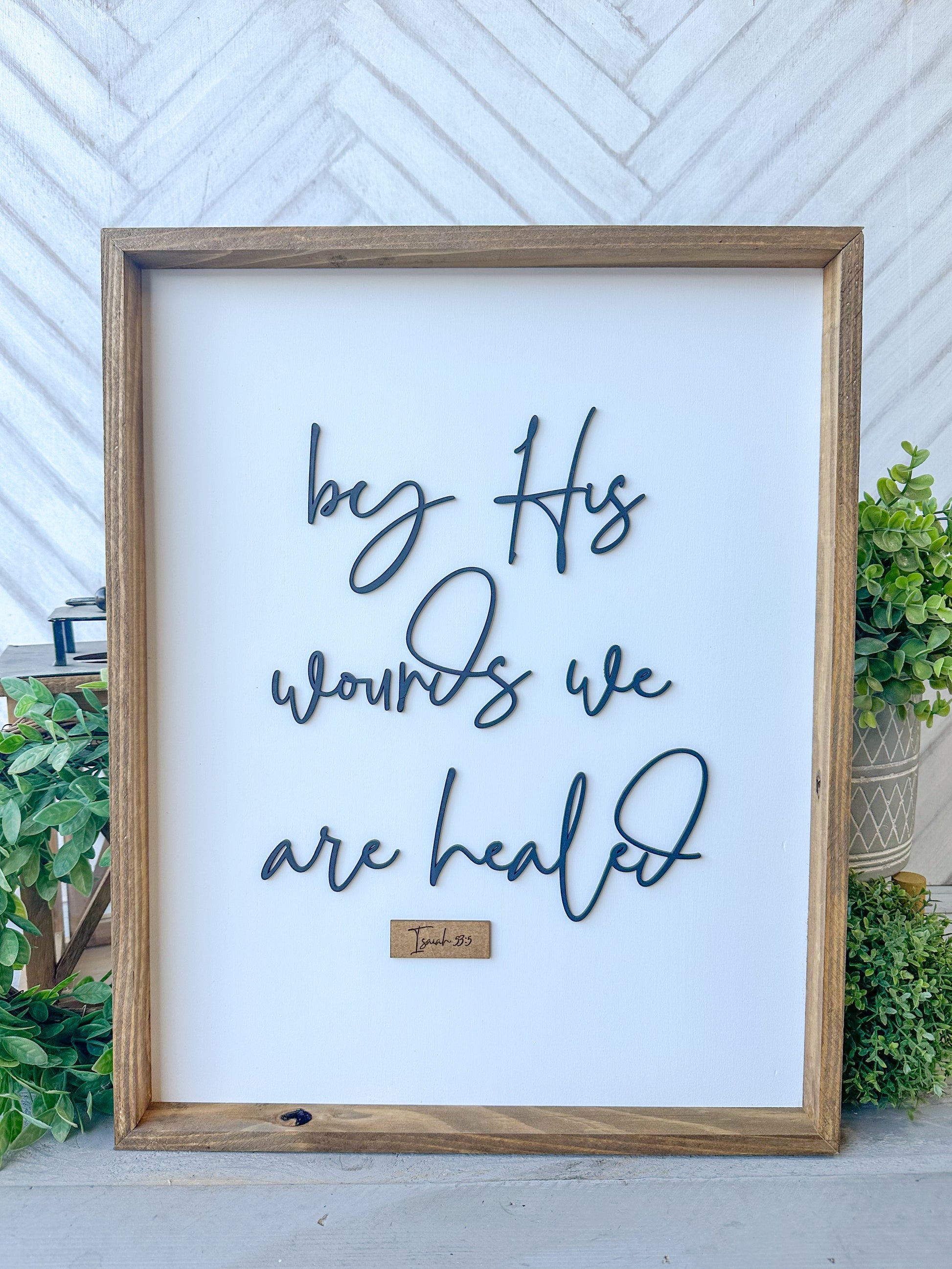 nspire faith and hope with this beautifully handcrafted Christian wall sign featuring the powerful scripture, "By His Wounds We Are Healed" (Isaiah 53:5). Designed with elegant 3D laser-cut lettering on a crisp white background, this piece is framed in reclaimed wood, bringing warmth and meaning to any space.