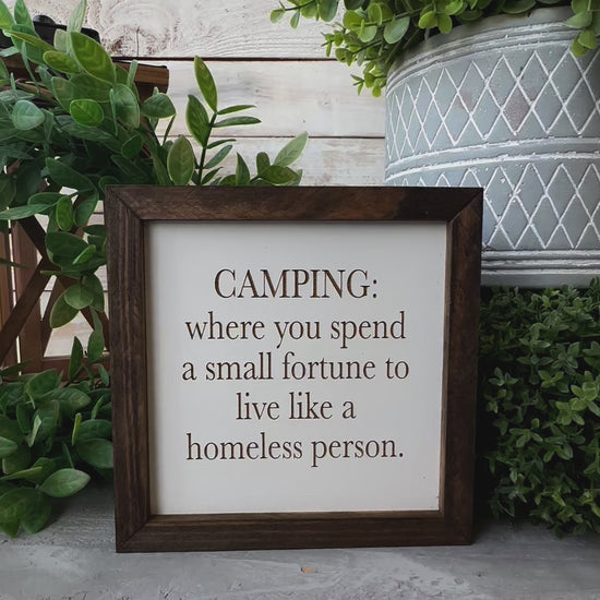 Camping where you spend a small fortune to live like a homeless person. Laser engraved wood sign.