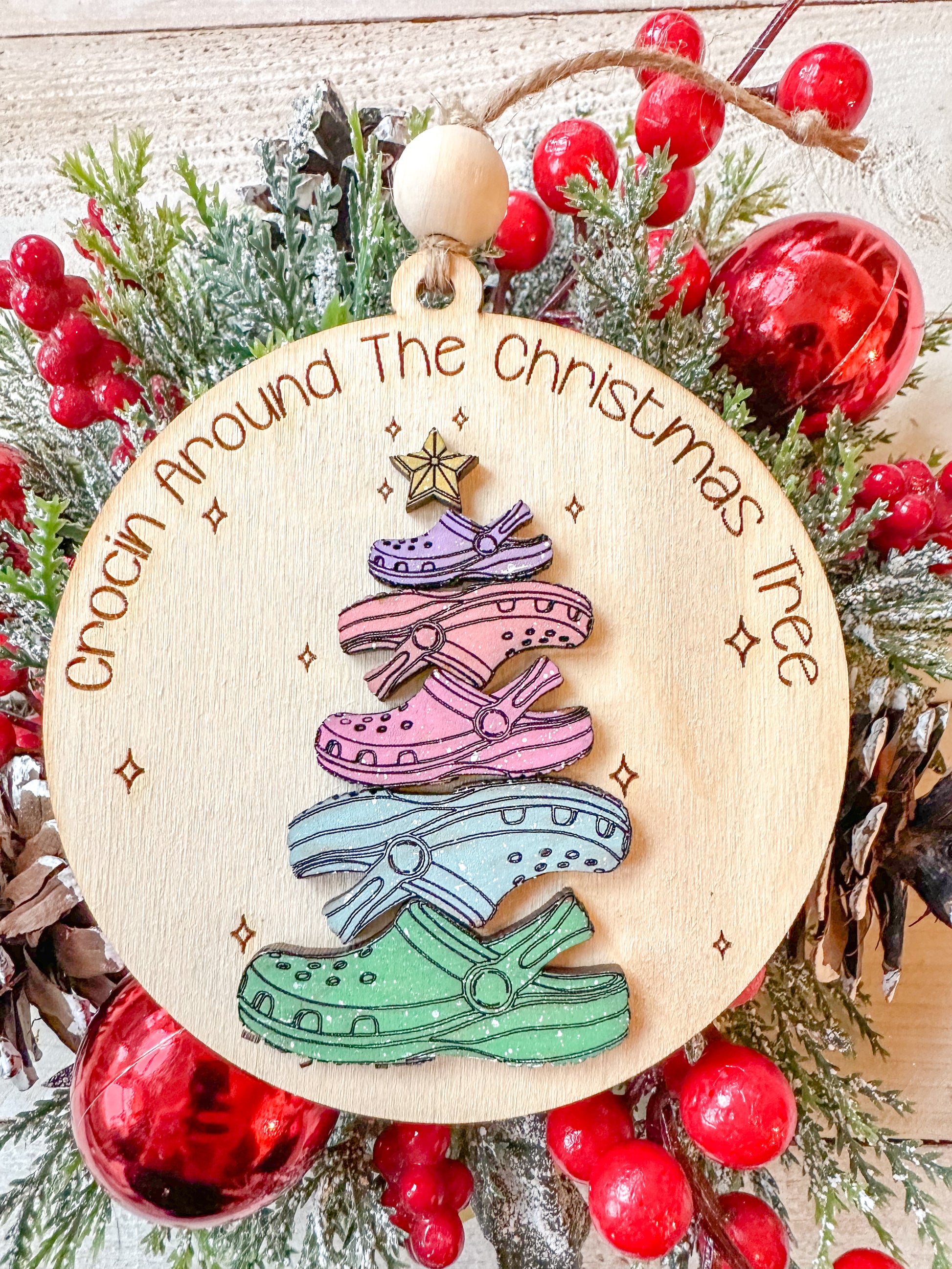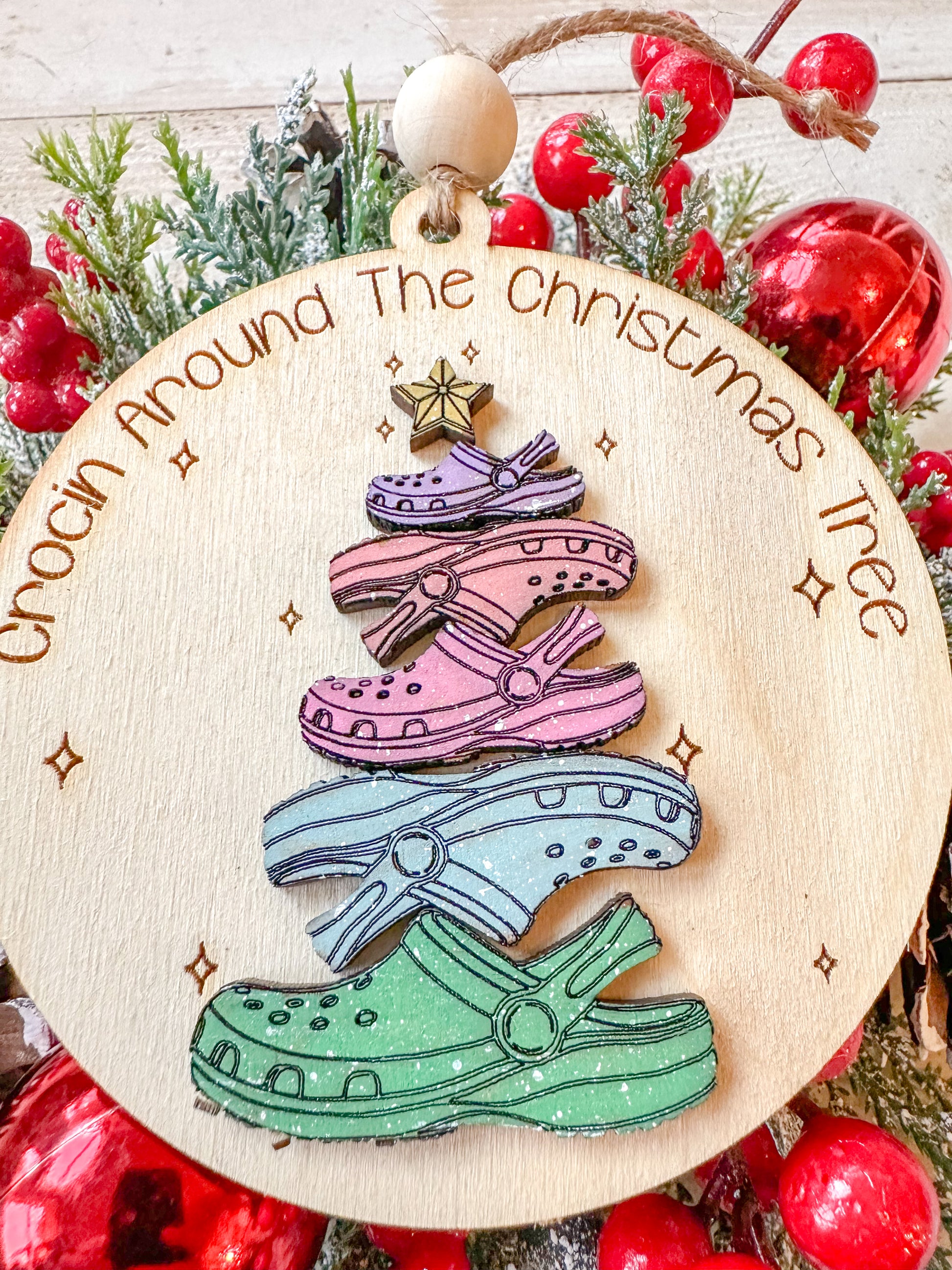 Bring a touch of whimsy and fun to your holiday decor with this playful "Crocin' Around the Christmas Tree" ornament! Featuring a stack of colorful crocs topped with a festive star, this handcrafted ornament is perfect for croc lovers and anyone who enjoys adding a little humor to their holiday celebrations. A unique and cheerful addition to any Christmas tree or a thoughtful gift for the croc enthusiast in your life.