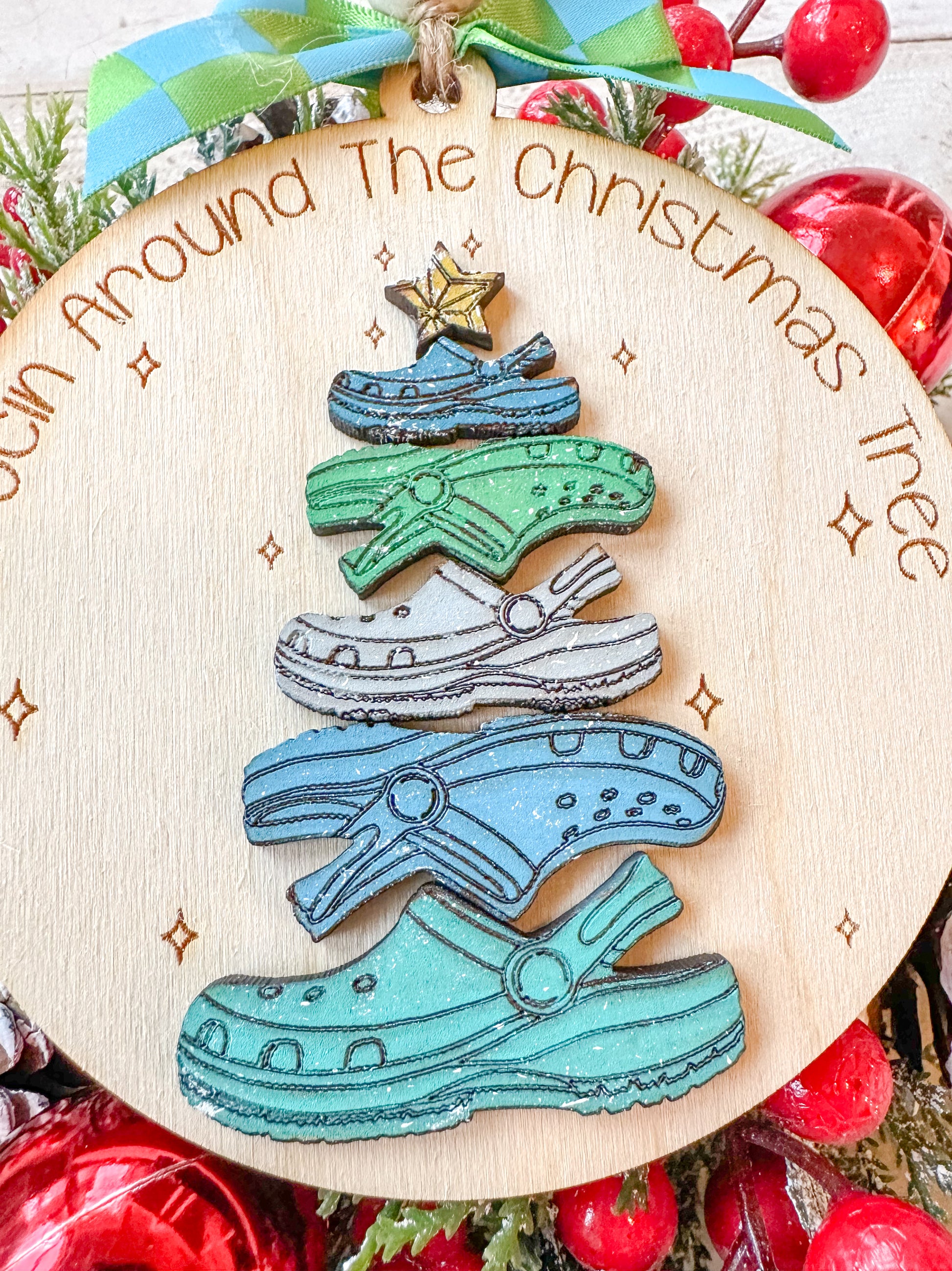 • Design: Laser-cut circular ornament with 3D stacked crocs and engraved festive text