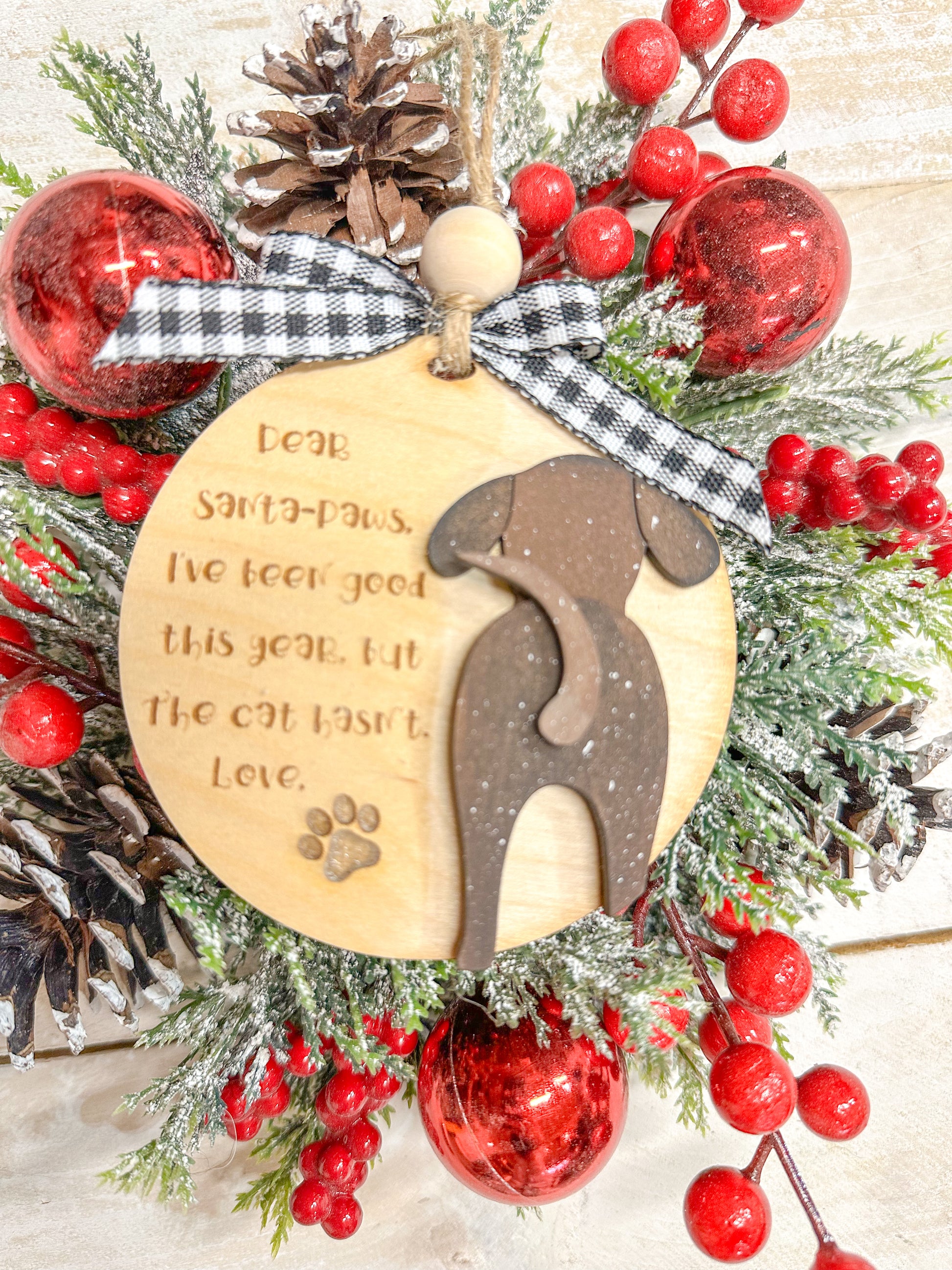 Celebrate your dog’s holiday spirit with the playful and adorable Dear Santa-Paws Dog Ornament. Featuring a rustic wood design, this ornament highlights a dog silhouette and a humorous engraved message: “Dear Santa-Paws, I’ve been good this year, but the cat hasn’t. Love, [paw print].” Perfect for dog owners with a sense of humor or as a gift for your pet-loving friends, this charming ornament will bring smiles and laughter to any Christmas tree.