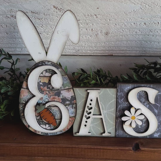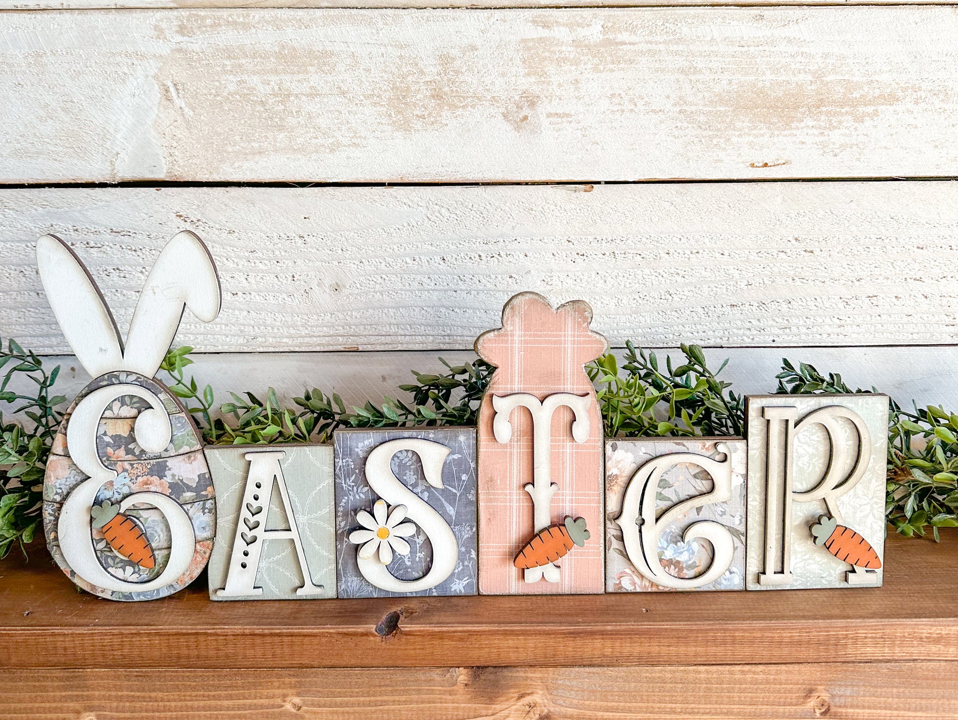 Each block is hand-painted and layered with laser-cut letters and designs for a dimensional look that stands out. Whether you’re decorating for an Easter brunch, spring gathering, or just adding a festive touch to your space, this set is a must-have!