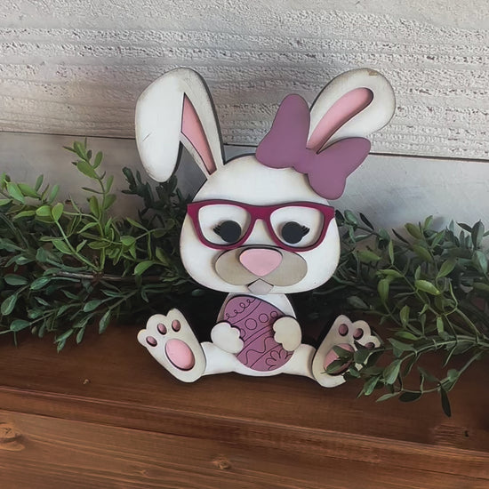 Hop into Easter with this adorable nerdy bunny shelf sitter! With its cute pink glasses, charming bow, and a decorated Easter egg in hand, this handcrafted wooden bunny is the perfect way to add a fun and quirky touch to your spring decor. Whether you're decorating your tiered tray, mantel, or Easter table centerpiece, this sweet little bunny brings playful charm to any space.
