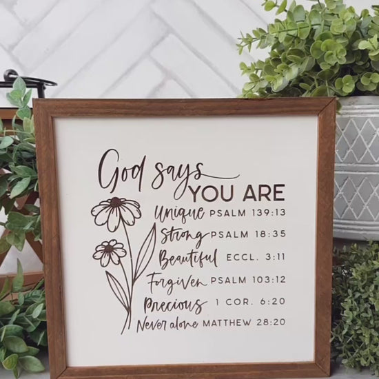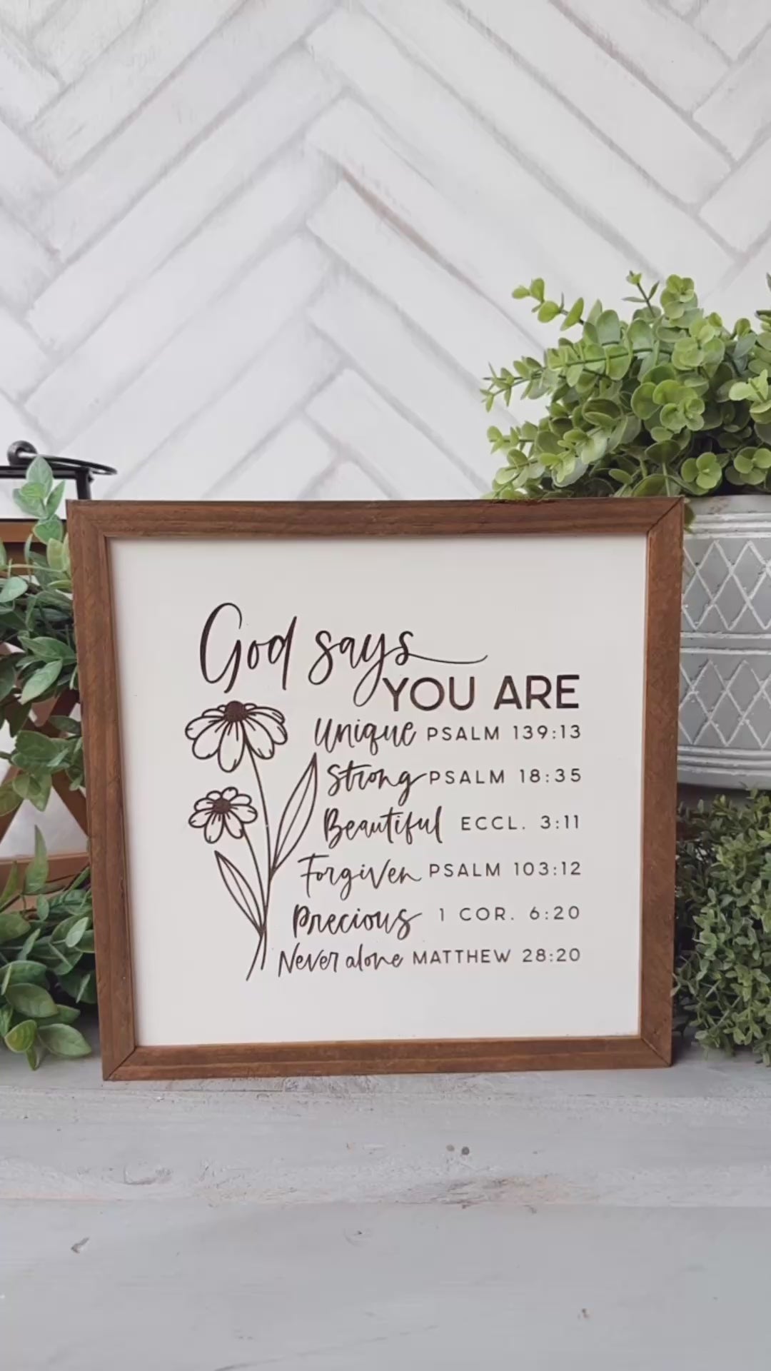 Celebrate your worth with our “God Says You Are” laser-engraved wooden sign, designed to remind you of your value and beauty as stated through selected Bible verses. Each phrase on this sign—unique, strong, beautiful, forgiven, precious, never alone—is accompanied by a corresponding scripture, making it a powerful and affirming piece of home decor.