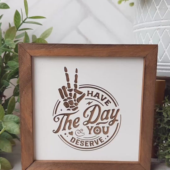 Add a cheeky and slightly edgy vibe to your home or office with this “Have the Day You Deserve” wooden sign, featuring a skeleton hand flashing the peace sign. Perfect for those with a sharp sense of humor, this laser-engraved sign blends rustic farmhouse decor with modern wit. At approximately 6” x 6”, it’s the ideal size to add a touch of personality to any space.