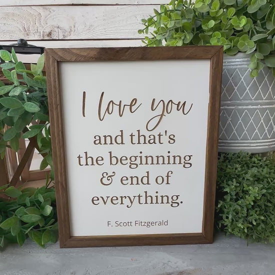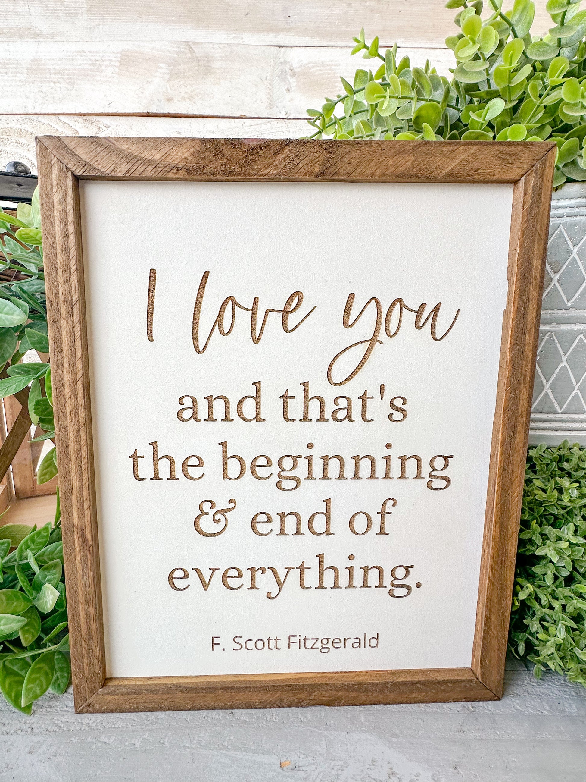 I love you and that’s the beginning and the end of everything F.Scott Fitzgerald. Laser Engraved Wood Sign.