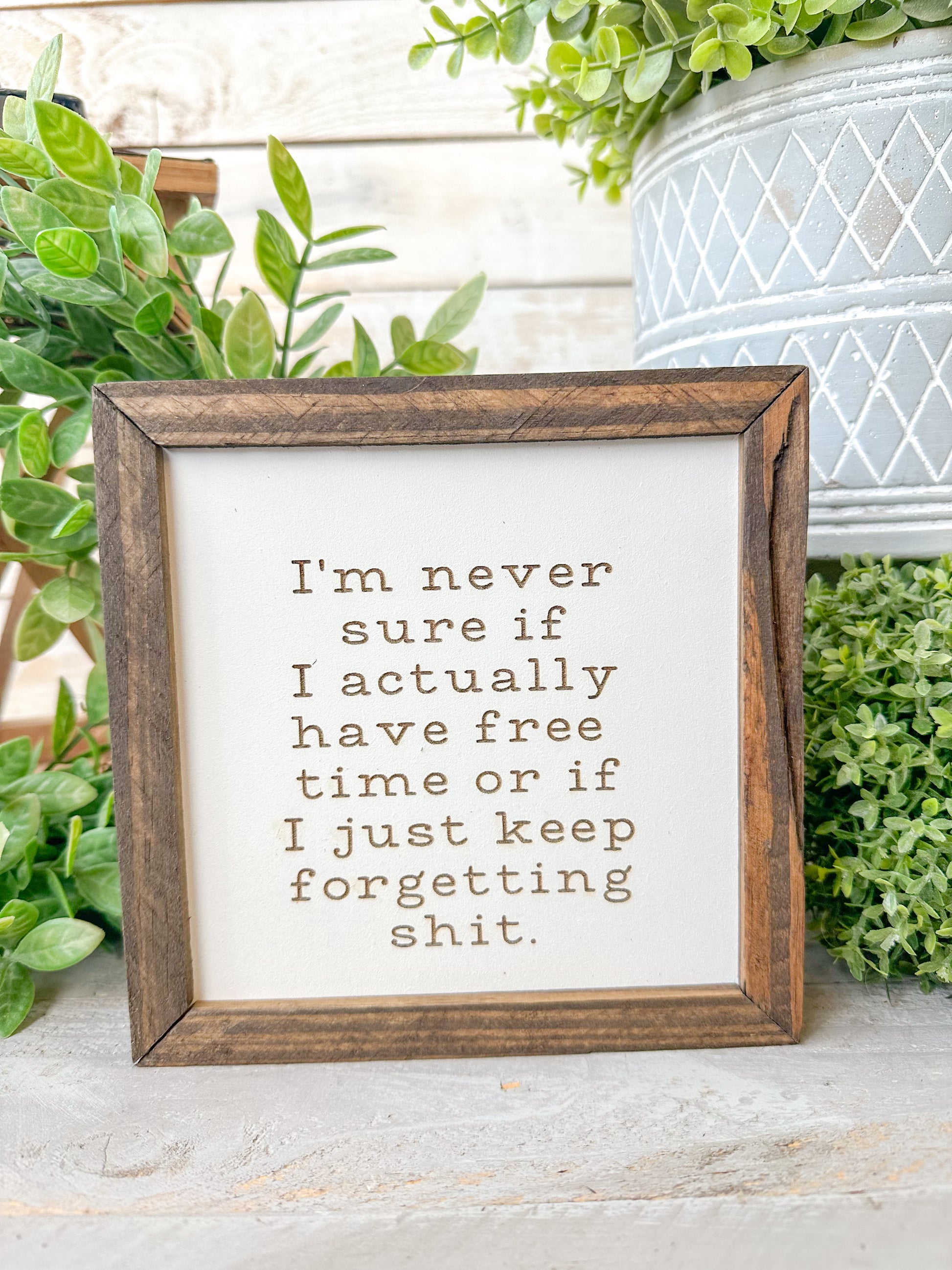 Ever wonder if you actually have free time or if you just keep forgetting things? This 6x6 handcrafted wooden sign perfectly sums up that all-too-relatable feeling with the laser-engraved phrase: