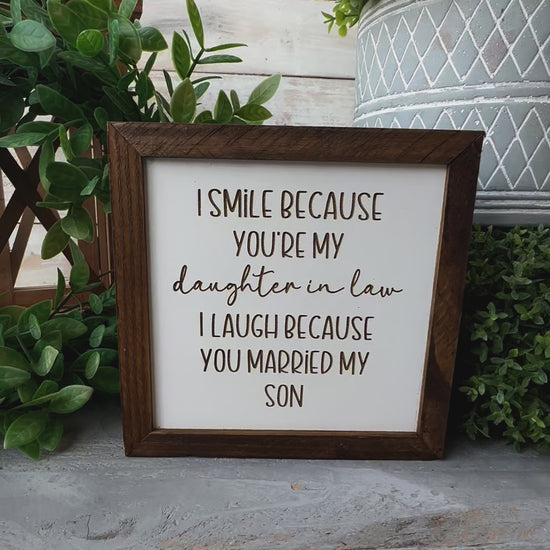 I smiled because you’re my daughter-in-law. I laughed because you married my son. Laser Engraved Wood Sign.