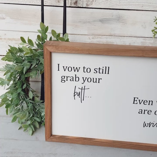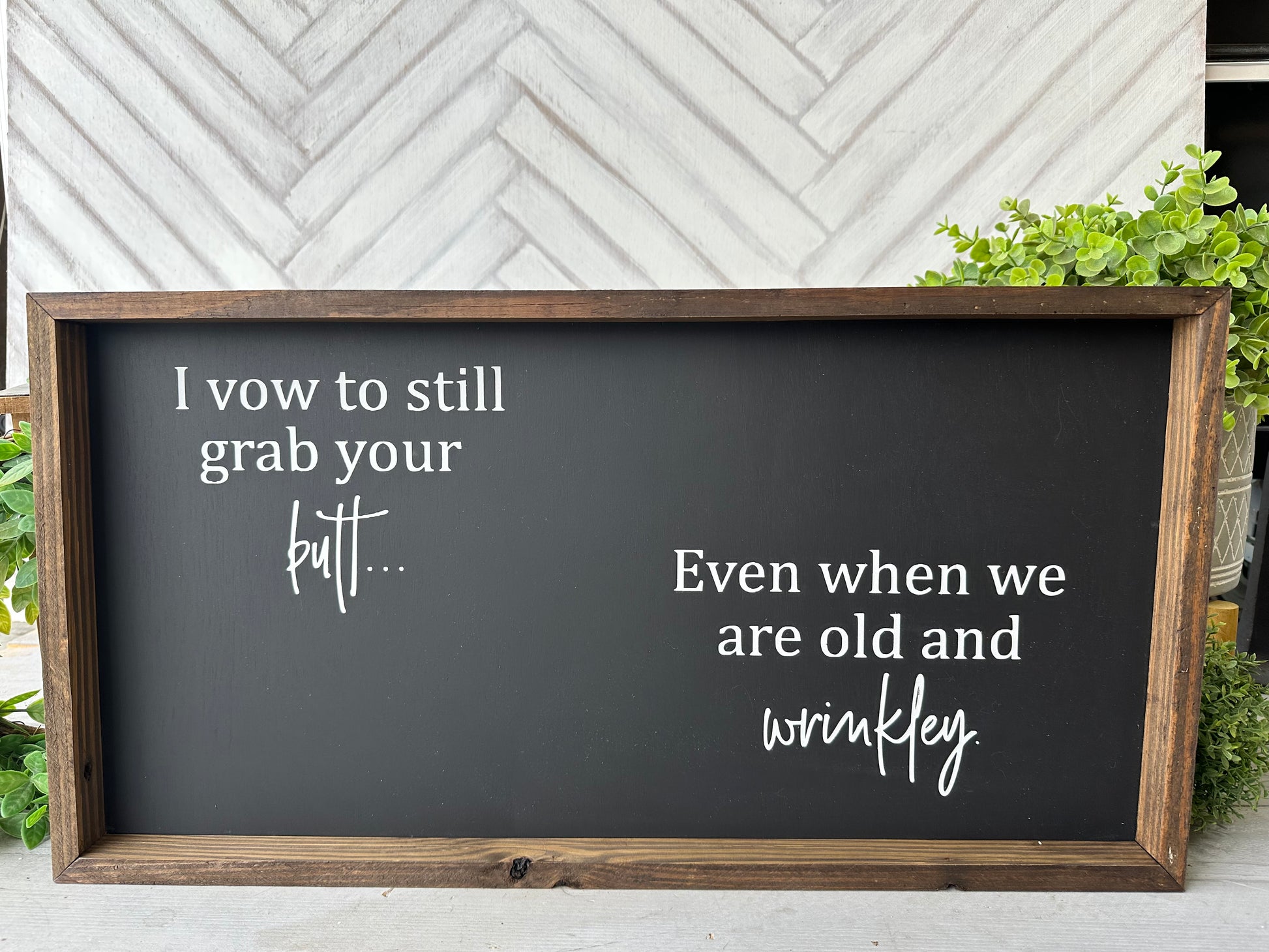 Add a touch of humor and love to your home with this handcrafted wooden sign, perfect for newlyweds, long-time couples, or as a unique anniversary gift. Featuring the playful phrase, "I vow to still grab your butt… even when we are old and wrinkly," this rustic farmhouse sign makes a great addition to your master bedroom, wedding decor, or anniversary celebration. Whether you're looking for a funny wedding gift, a sentimental engagement present, or a romantic yet cheeky anniversary sign, this piece is sure to bring smiles for years to come.
