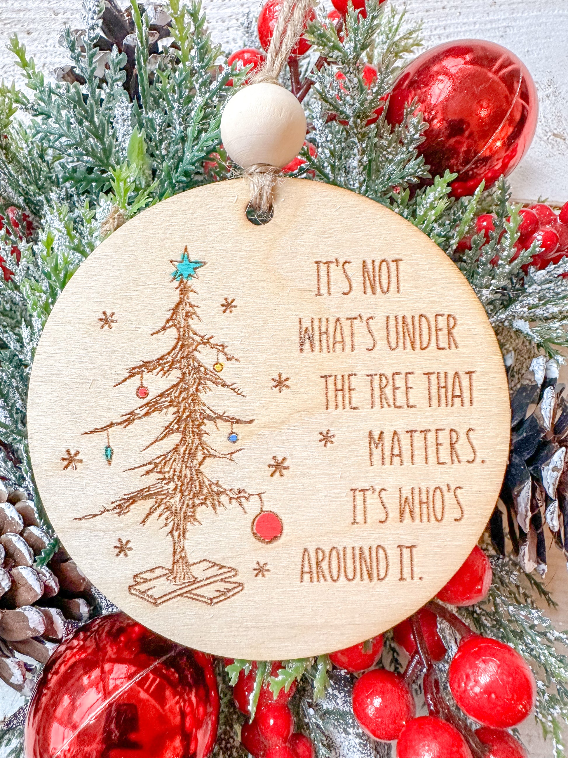 Celebrate the true spirit of the holidays with this heartfelt “It’s Not What’s Under the Tree That Matters, It’s Who’s Around It” ornament. Featuring a charming engraved Christmas tree design and a meaningful message, this ornament is a beautiful reminder of what truly makes the season special. Perfect as a thoughtful gift or a meaningful addition to your own holiday decor.