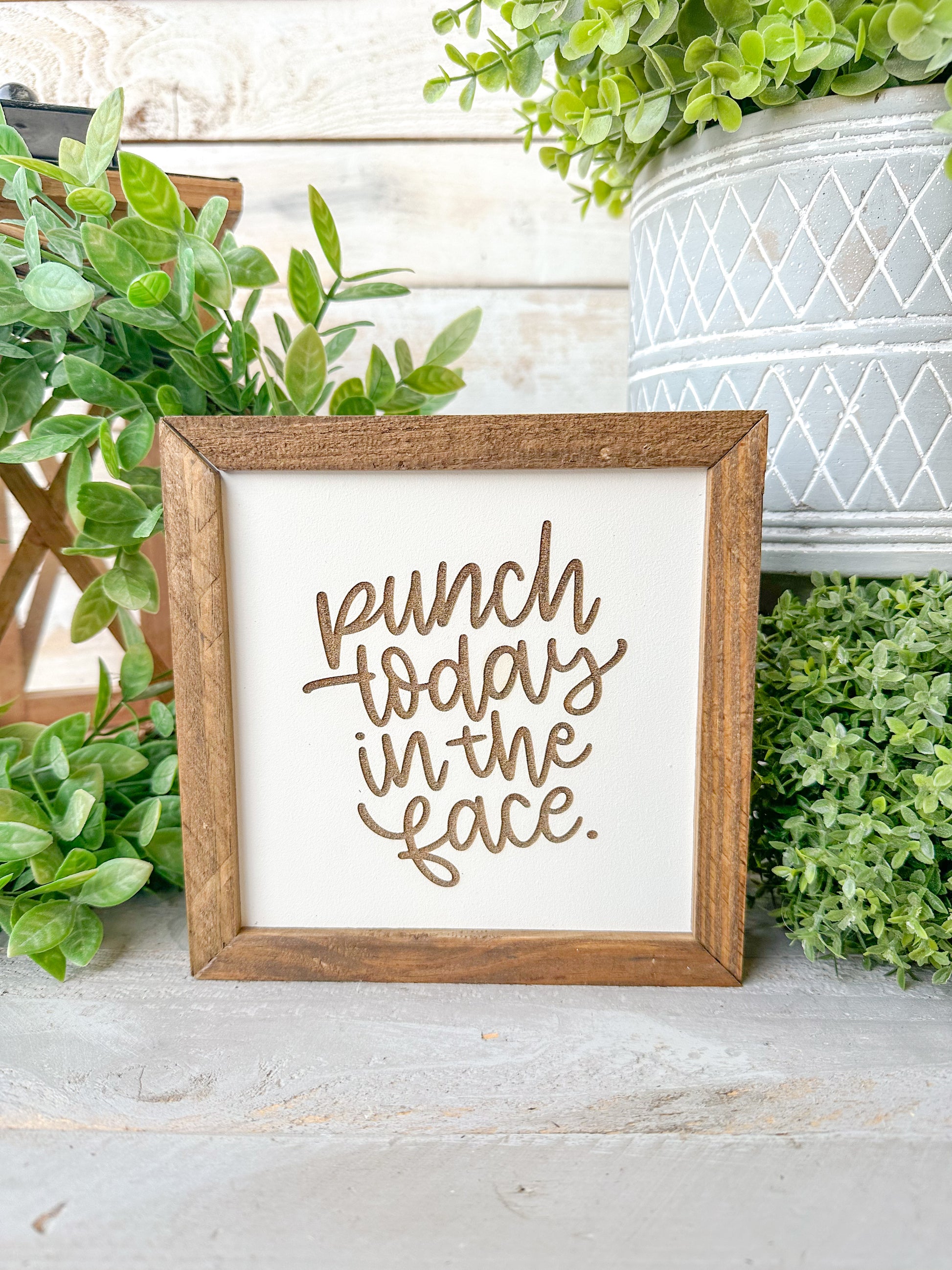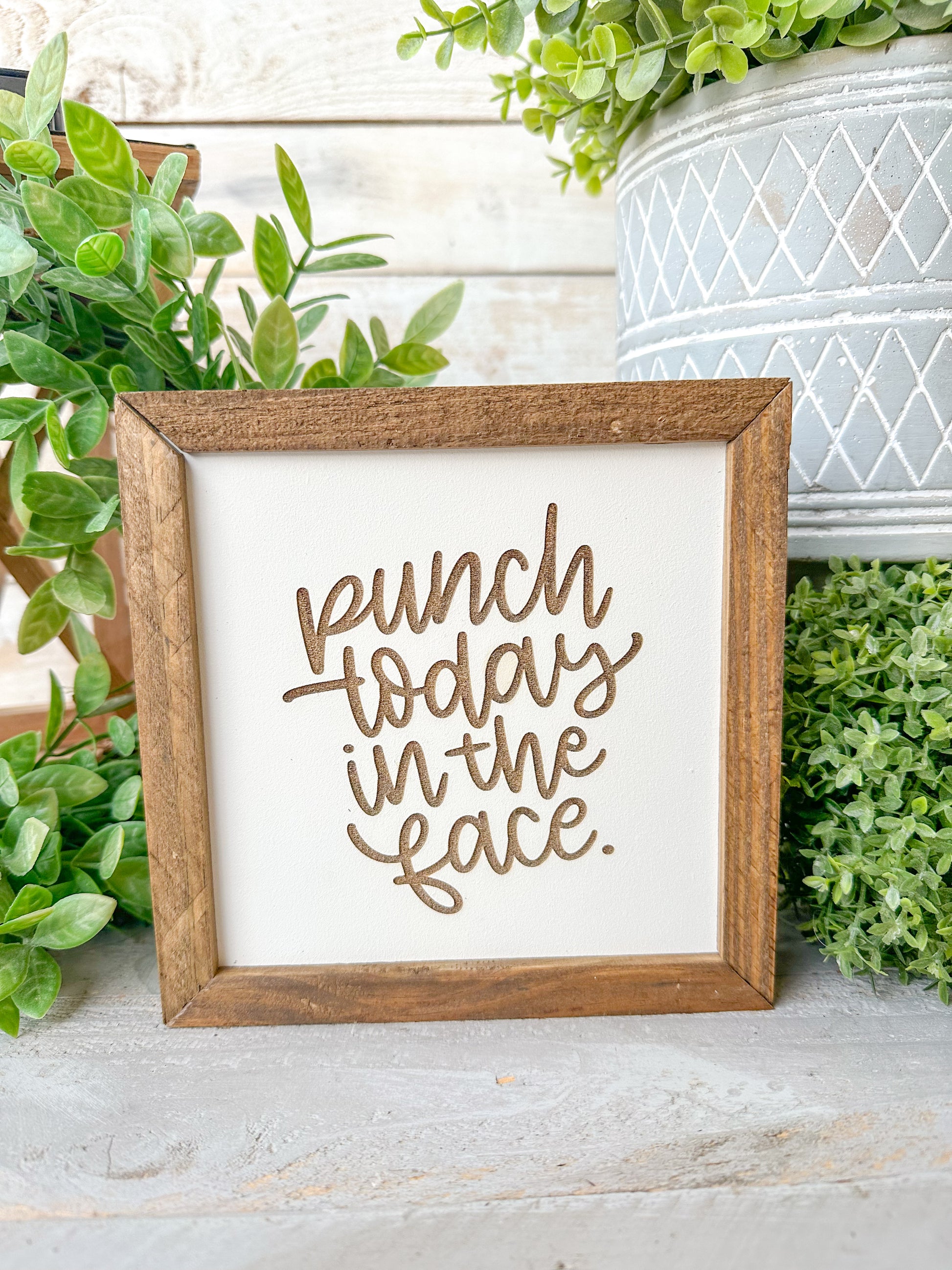 Start your day with a little motivation and humor! This laser-engraved wooden sign features the bold and cheeky phrase "Punch Today in the Face," perfect for go-getters, coffee lovers, and anyone who tackles life head-on. Whether it's for your office desk, home workspace, or entryway, this rustic sign brings a fun, empowering vibe to any space.