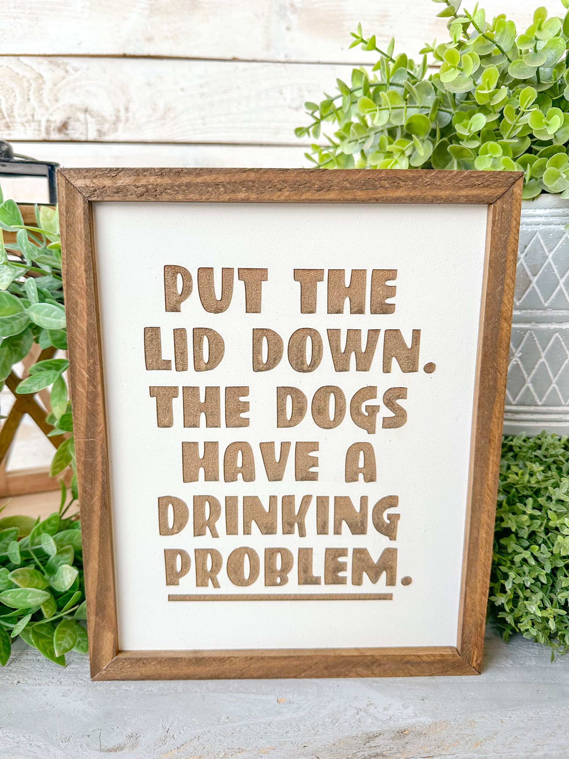 Put the lid down the dogs have a drinking problem. Laser engraved wood sign.