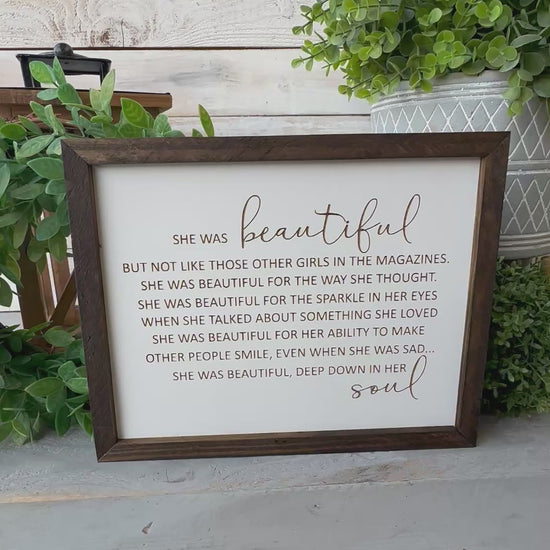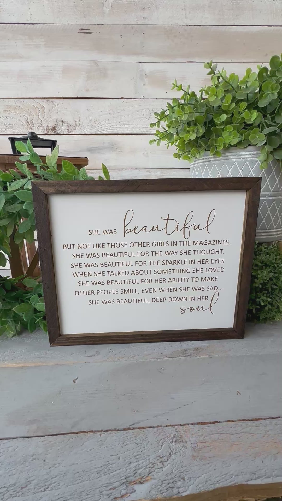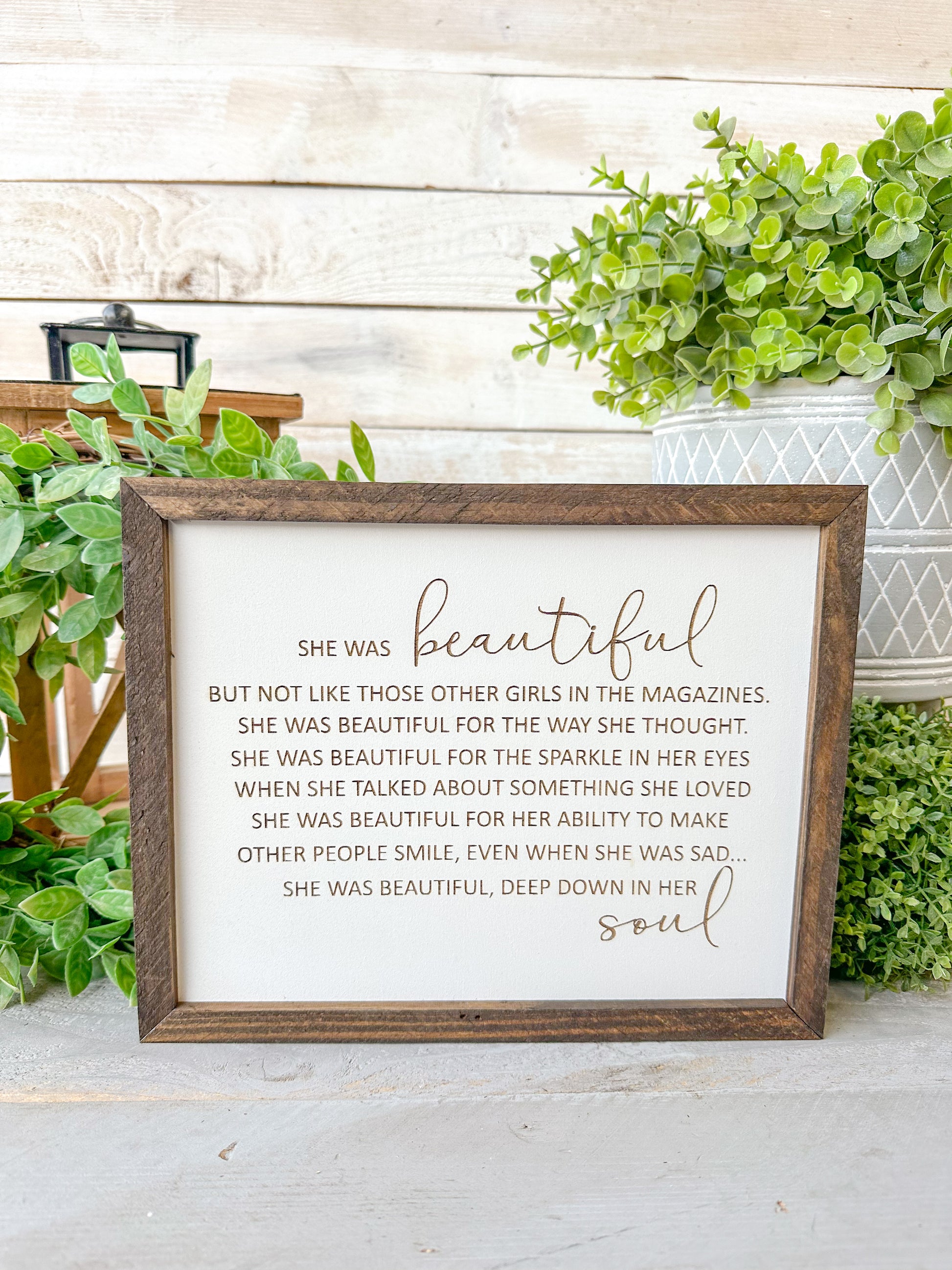 Celebrate true beauty with this handcrafted wooden sign featuring an inspiring quote about what makes someone truly beautiful. This elegant design highlights the words She Was Beautiful in a graceful script font, with the rest of the heartfelt message engraved in a timeless serif style.
