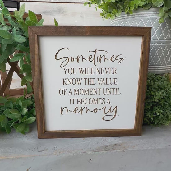 Sometimes you will never know the value of a moment until it becomes a memory. Laser engraved wood sign.