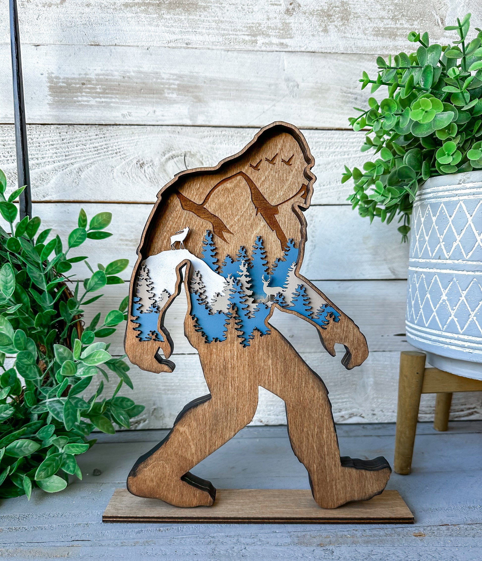 Calling all Bigfoot believers! This handcrafted six-layer standing Bigfoot is the perfect statement piece for Sasquatch enthusiasts, outdoor lovers, and rustic home decor fans. Made from six layers of precision-cut 1/8 wood, this freestanding piece showcases an intricate forest and mountain scene within the silhouette of the legendary creature himself. Whether you're adding it to your mantel, office, cabin, or Bigfoot collection, this unique design is sure to spark conversation!