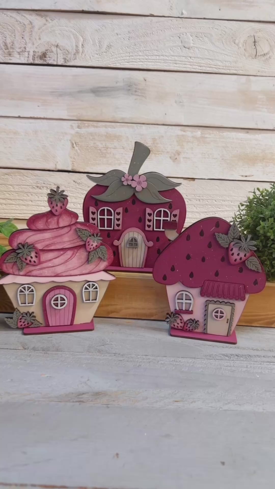 Bring a touch of sweet summer charm to your home with these Strawberry Standing Houses – a whimsical trio of handcrafted wooden decor pieces that stand on their own and are full of berry-themed details! Each house features layered 3D accents, adorable strawberry designs, and hand-painted finishes in soft berry tones that blend perfectly into tiered trays, shelf displays, or countertops.