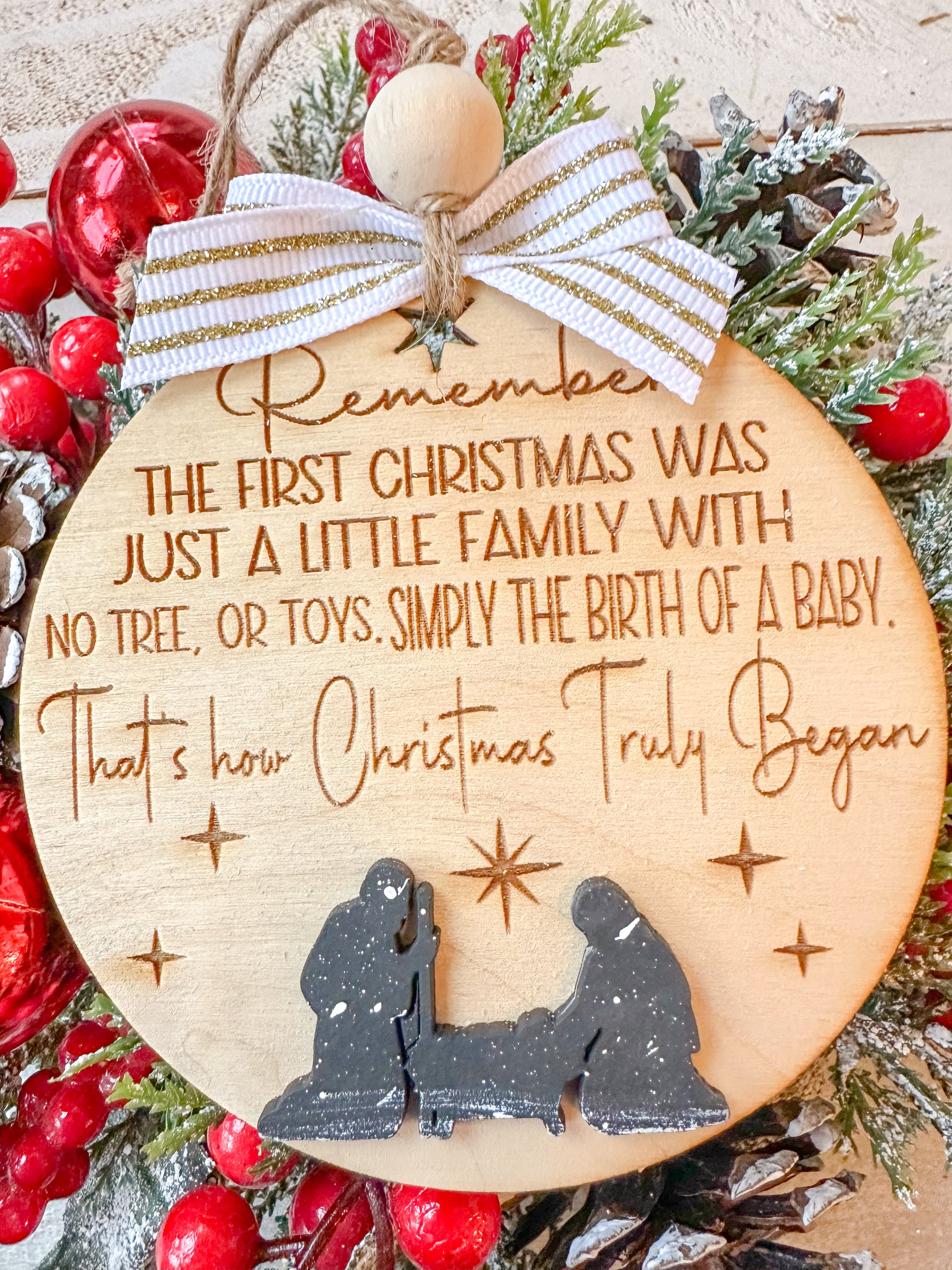 Celebrate the true meaning of Christmas with this heartfelt "The First Christmas" ornament. Featuring a beautifully engraved message and a delicate 3D nativity scene, this piece reminds us that Christmas began with a humble family and the birth of a baby. Its timeless design makes it a meaningful addition to your holiday decor or a special gift for loved ones.