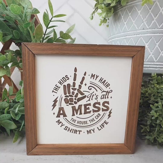 Celebrate the chaotic beauty of life with our "It’s All A Mess" laser-engraved wood sign. This playful and relatable design highlights the humor in everyday messes, from kids and cars to hair and shirts. Perfect for busy moms, dads, or anyone who thrives amidst the chaos, this sign adds charm and wit to your home decor. Whether displayed in the living room, kitchen, or entryway, it’s sure to bring a smile to every visitor. A thoughtful gift for parents or anyone who embraces life’s imperfect moments.