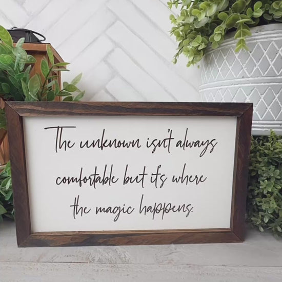 The Unknown isn’t always comfortable, but it’s where the magic happens laser engraved wooden sign