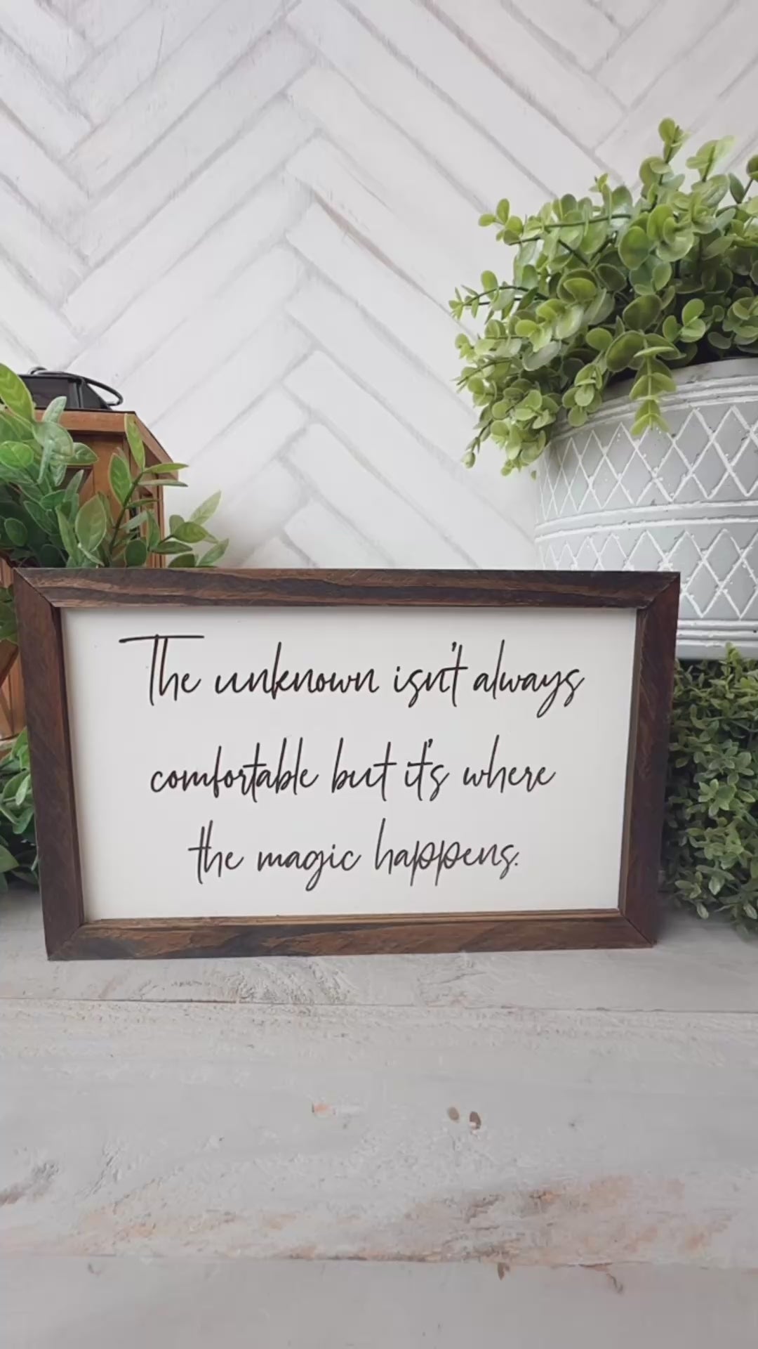 Bring inspiration into your space with this beautifully designed "The unknown isn't always comfortable, but it's where the magic happens" laser-engraved wood sign. A daily reminder to embrace uncertainty and discover new opportunities, this sign is perfect for anyone on a journey of growth and transformation. With its minimalist script and rustic frame, it seamlessly fits into modern, farmhouse, or boho decor styles. Perfect for living rooms, offices, or gift-giving, this sign is a timeless piece that will uplift and motivate.