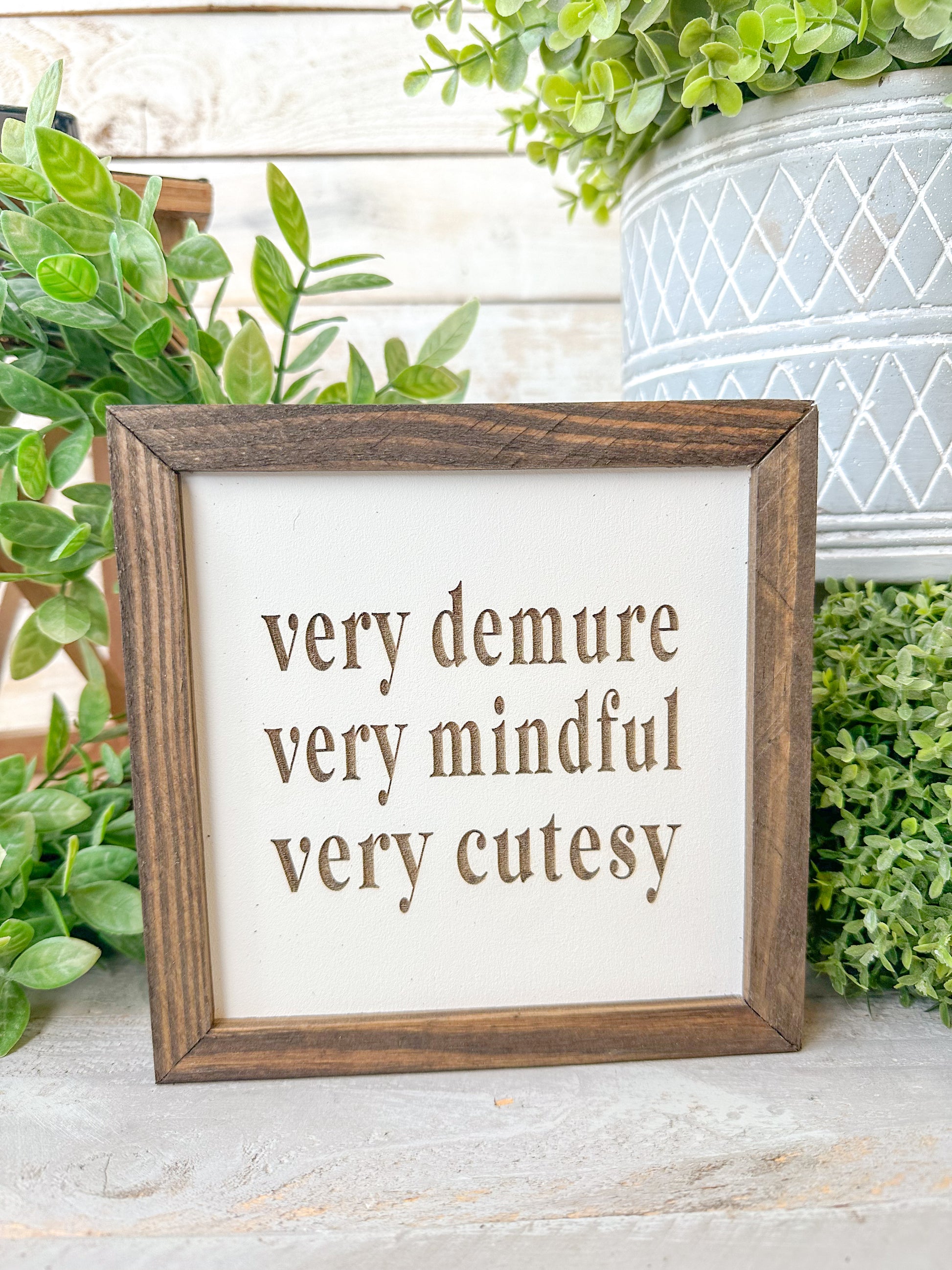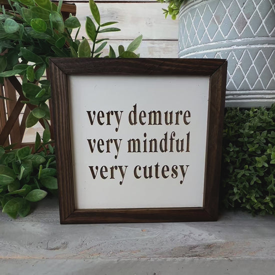 Very demure very mindful very cutesy. Laser engraved wood sign.