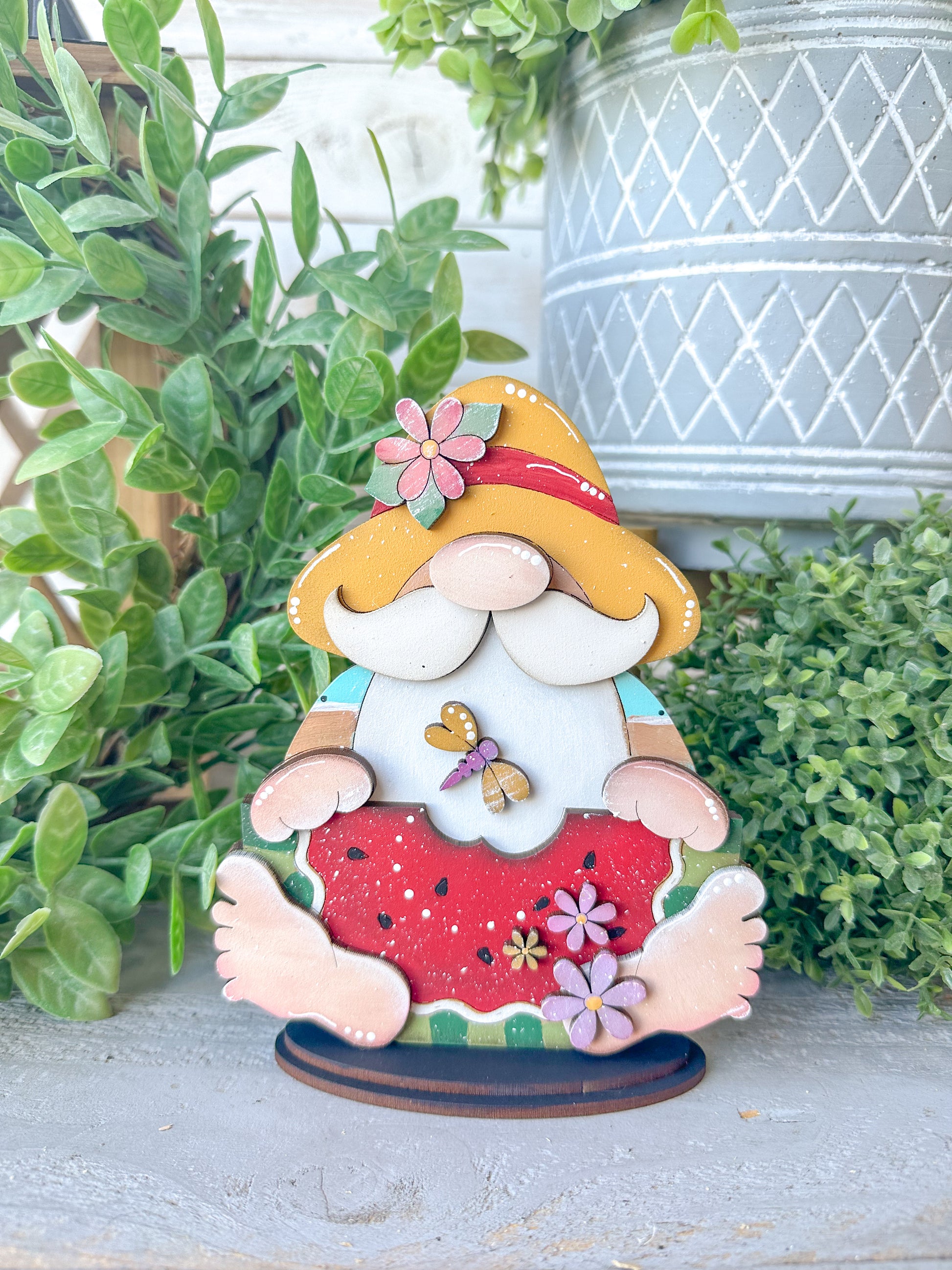 Add a slice of summer sweetness to your home décor with this adorable Watermelon Gnome! Standing approximately 4” x 6”, this charming shelf sitter is handmade from quality wood and hand painted in fresh, vibrant colors. With his watermelon hat, rosy nose, and playful personality, he’s perfect for tiered trays, mantels, bookshelves, or gifting to a fellow gnome lover.