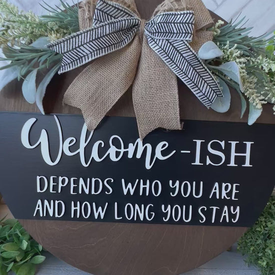 Funny Welcome-ish Sign - 18” Handcrafted Wood Round with Burlap Bow & Greenery