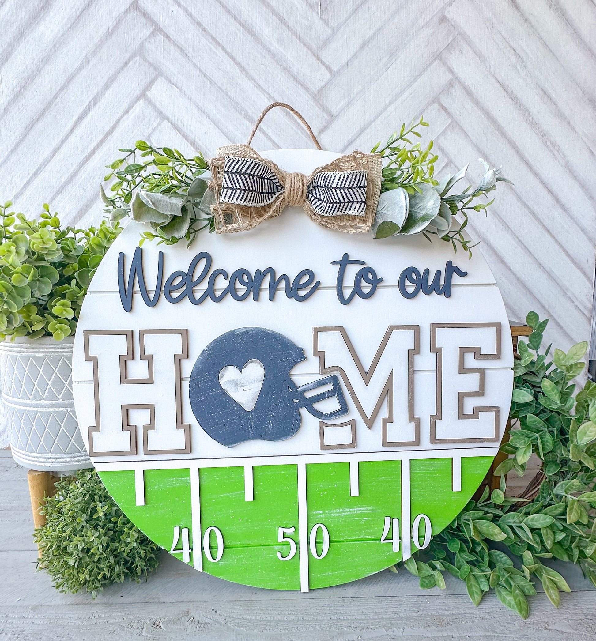 Get ready for football season with our handcrafted 18” wooden “Welcome to Our Home” football door hanger. Designed with layered 3D lettering, a football helmet accent, and hand-tied bow with seasonal greenery, this round door sign is a farmhouse-style way to welcome guests on game day.