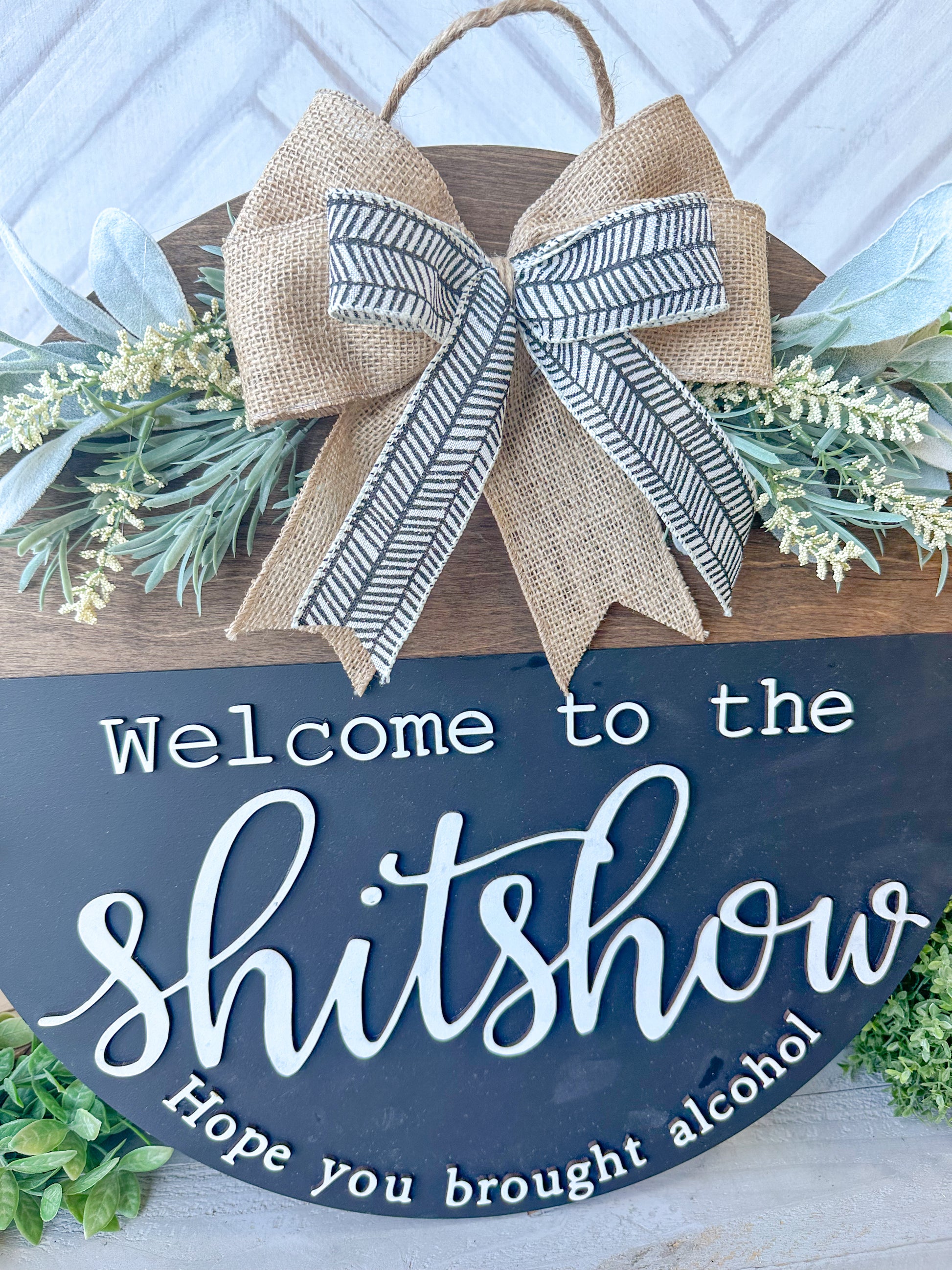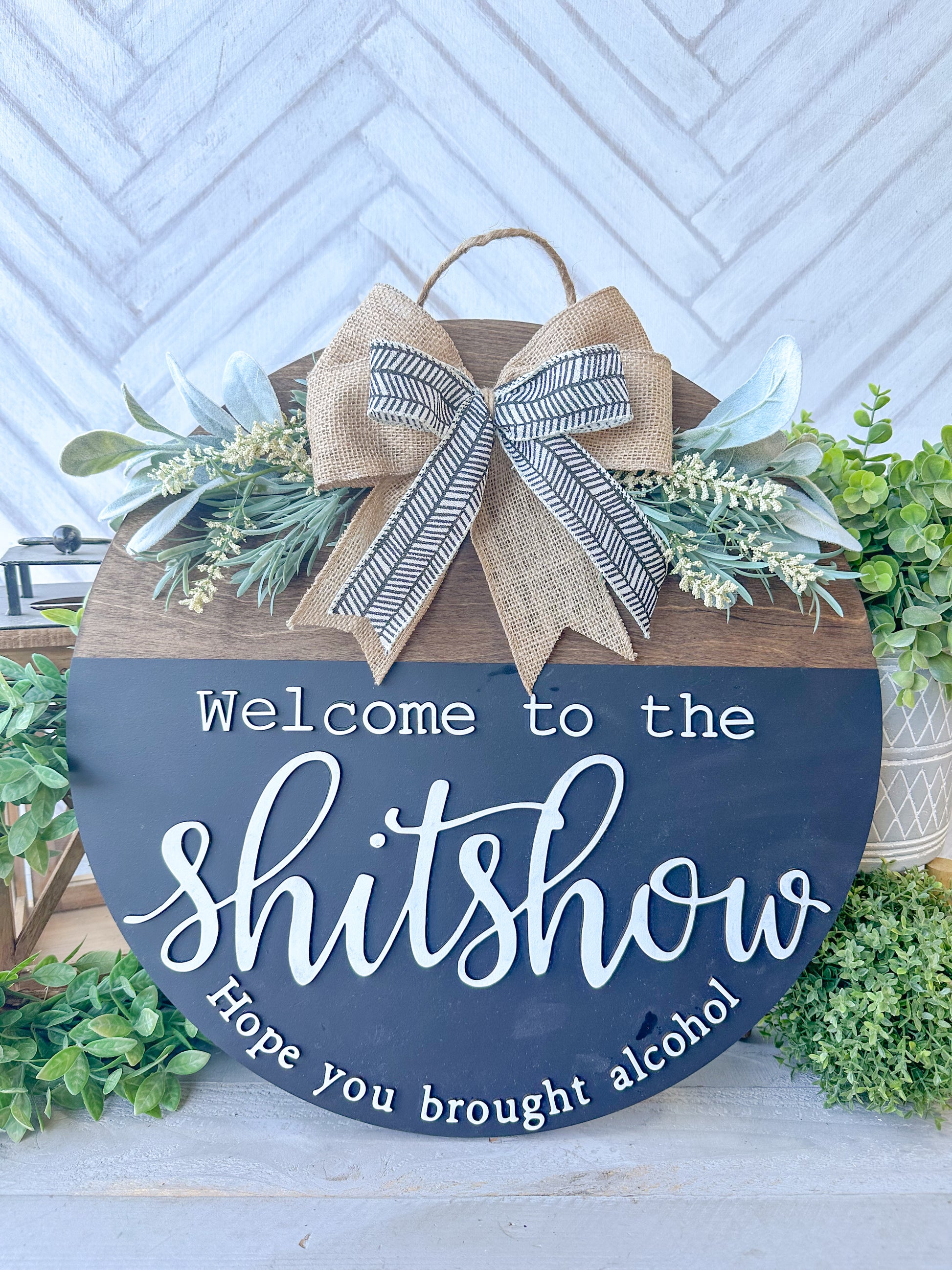 Set the tone for laughter and good vibes with this 18-inch handcrafted wood round sign that boldly declares, Welcome to the Shitshow Hope You Brought Alcohol. This playful sign is the perfect addition to any entryway, kitchen, bar area, or gathering space where humor is always welcome.