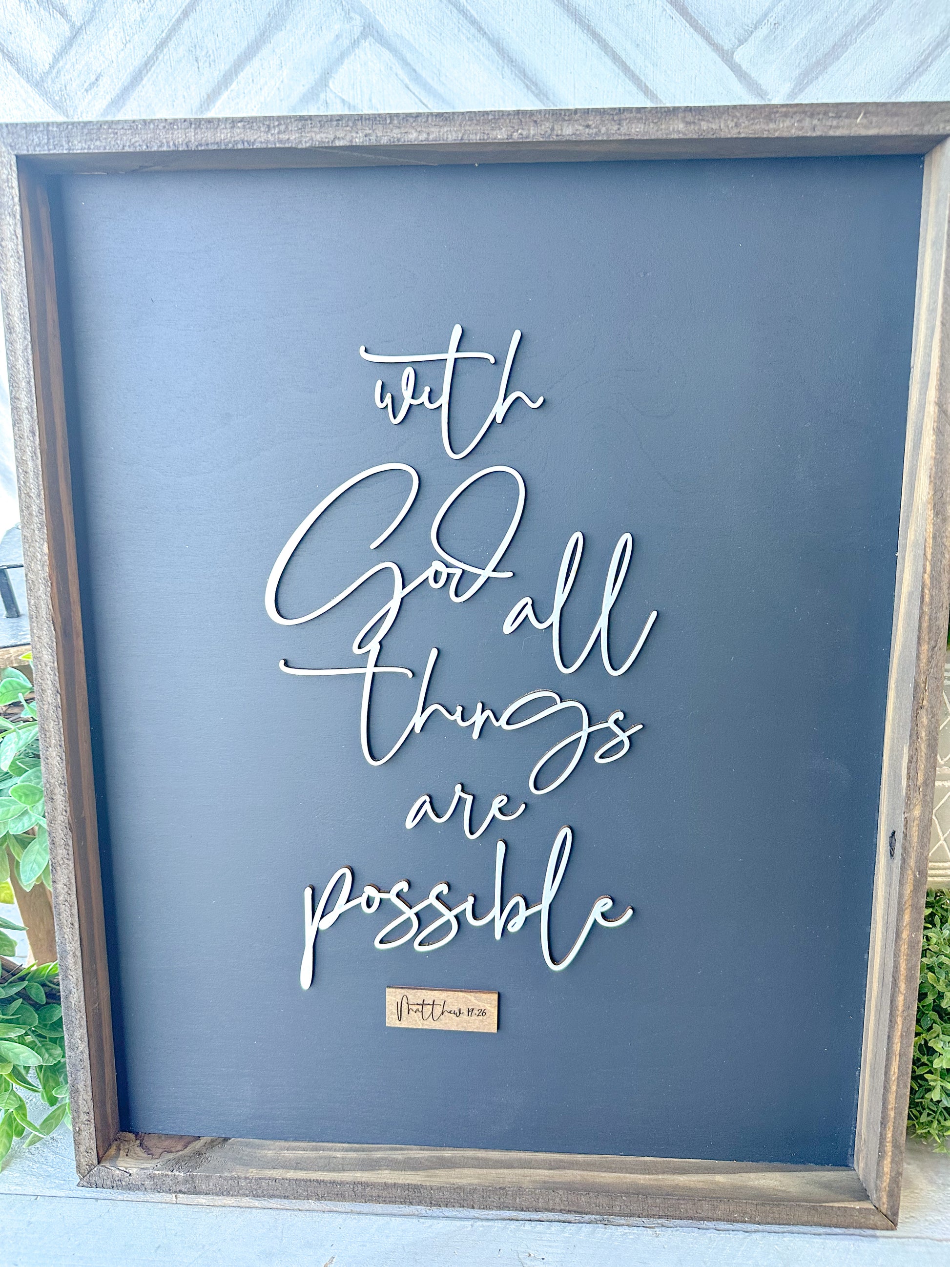 Fill your home with faith and encouragement with this beautifully handcrafted Christian wall sign featuring the uplifting scripture, "With God All Things Are Possible" (Matthew 19:26). The elegant 3D laser-cut white lettering stands out against a bold black background, framed in reclaimed wood for a timeless, rustic touch.